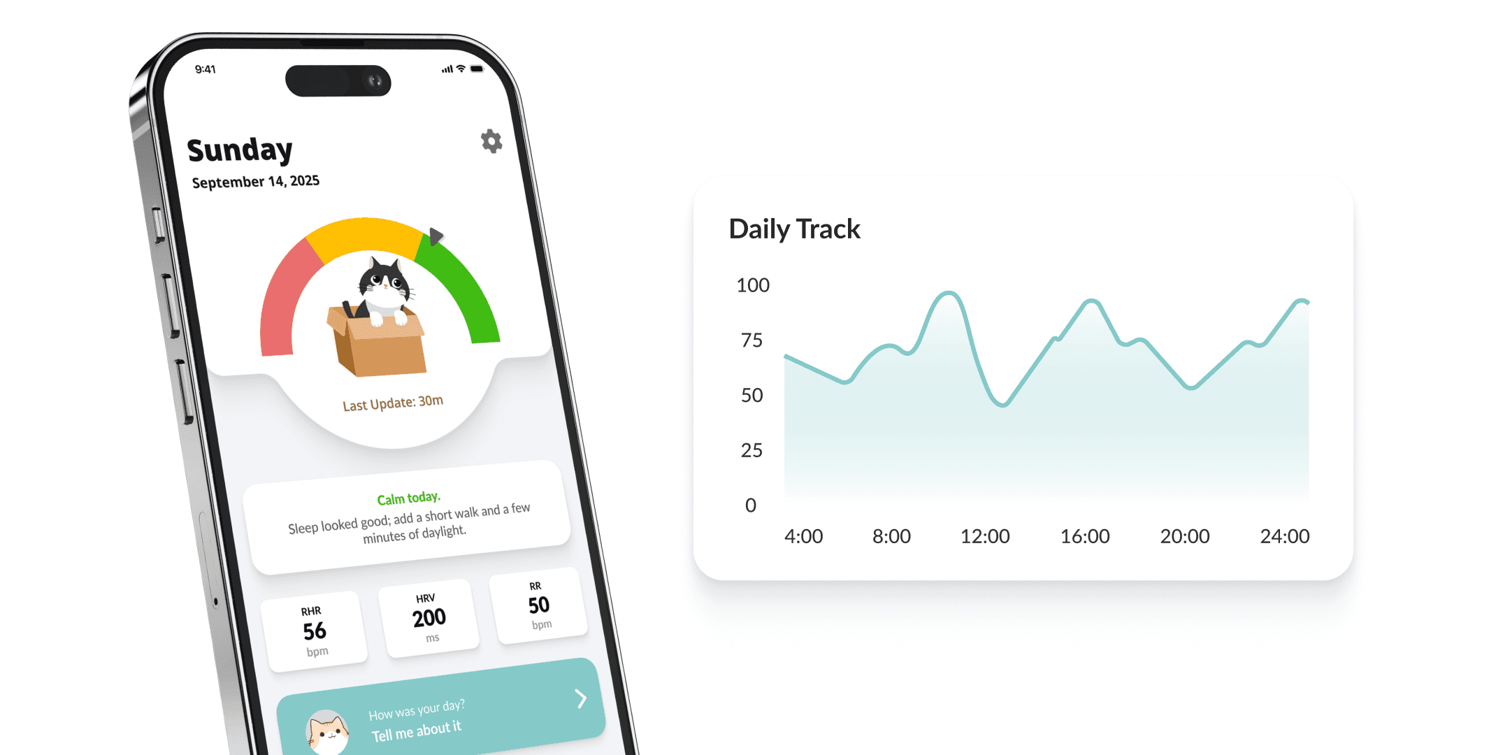 StressCat translates HRV, heart rate, and sleep data into moods you can relate to — relaxed, happy, or sleepy. Clear, human, never medical.
